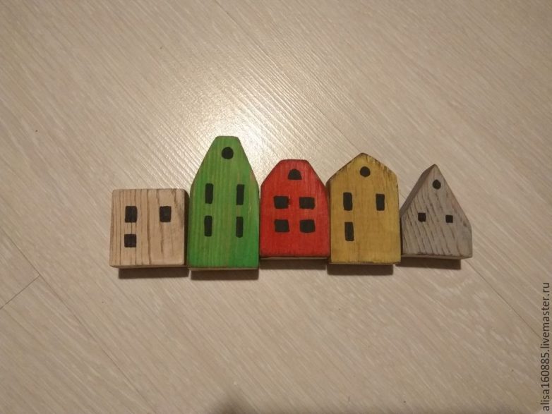 На верхней полке разместим вот такие маленькие домики. Заготовки для них выпиливаем из соснового бруска, подходящего по размеру. Домики шкурим среднезернистой наждачной бумагой и покрываем акриловыми красками разных цветов. После полного высыхания краски снова шкурим поверхность домиков, на ребрах и в некоторых местах стирая краску. Чтобы быстро состарить поверхность, наносим поверх краски морилку, излишки стираем влажной салфеткой. В тех местах, где краска была сошкурена, дерево окрасит морилка и придаст поверхности нужную фактуру.
