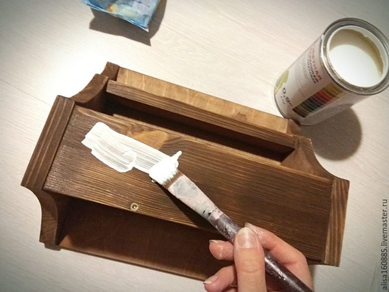 После браширования нанесем на всю поверхность полочки водную морилку цвета «Мокко» в один слой. Даем полностью высохнуть и шкурим мелкозернистой наждачной бумагой всю полочку. Удаляем пыль. Чтобы выявить рисунок дерева и немного состарить поверхность, окрасим полочку. У меня белая акриловая эмаль. Наносим краску и сразу стираем излишки влажной салфеткой. Таким образом обрабатываем все изделие.
