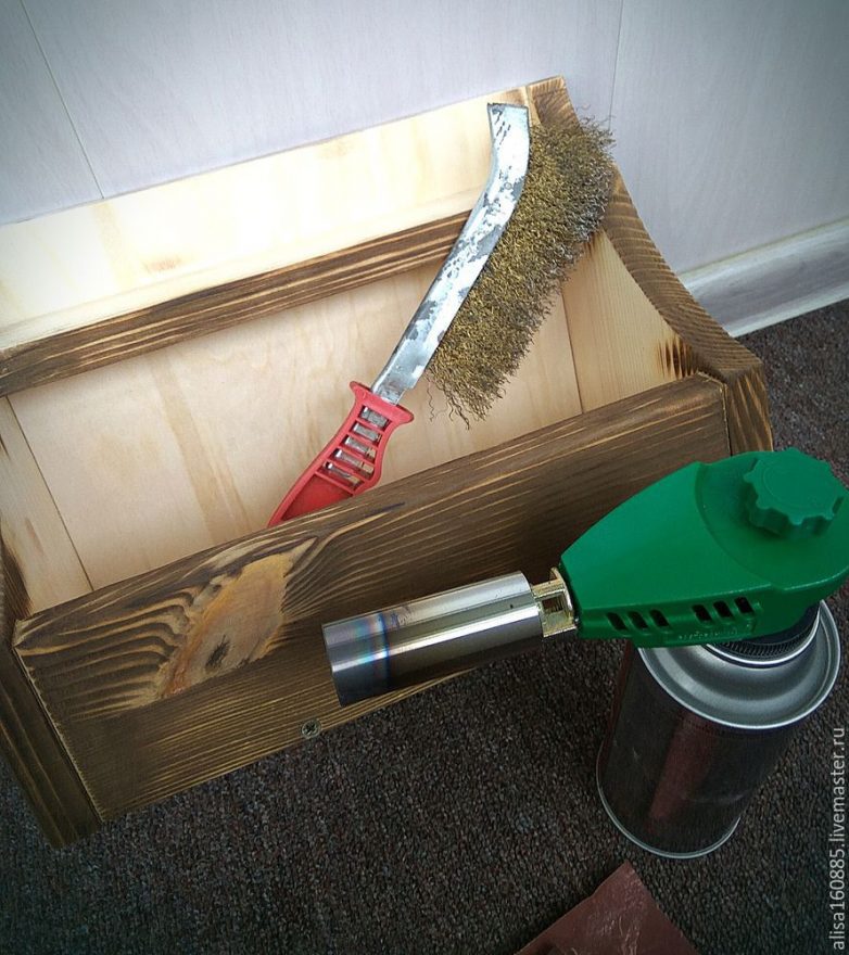 Сделаем брашировку боковых частей и передней стенки полочки. Для этого понадобится газовая горелка, щетка по металлу и наждачная бумага средней зернистости. Горелкой обжигаем нужные поверхности. Щеткой счищаем обгоревшие волокна. Хорошо шкурим и удаляем пыль со всей поверхности заготовки. Делать это удобно пылесосом, после протереть сухой салфеткой или тканью без ворса.