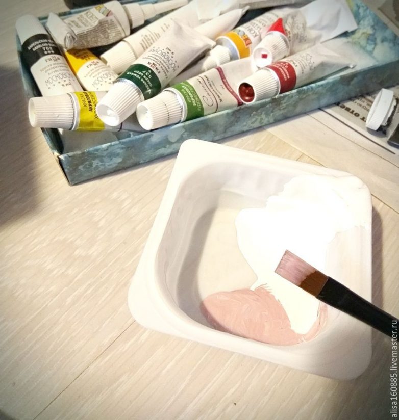 Теперь нам понадобятся цветные акриловые краски. Чистые цвета смешиваем с белой краской для получения менее ярких оттенков.Краску наносим на домики плоской кистью, у каждого домика свой цвет. Пока краска не высохла, стираем излишки влажной салфеткой, проявляя рельеф. Ждем полного высыхания краски, покрываем лаком, сушим.