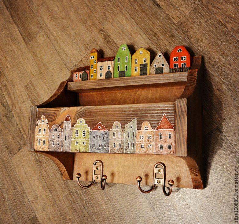 Такая полочка будет хранить ключи и важные мелочи и здорово облегчит жизнь хозяевам такого предмета интерьера.Также этот мастер-класс поможет своими руками сделать подарок для родных и близких, ведь скоро наступят новогодние праздники, так что самое время начать. Приступим.
