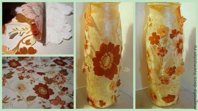 5. Вырезаем нужный цветочный мотив из салфетки. Расслаиваем до верхнего слоя, примеряем к поверхности, компонуем и приклеиваем веерной кистью с разведенным в воде акриловым лаком.