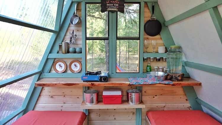Избушка идеально подходит для проживания двух человек и включает в себя две односпальные кровати и полочки, на которых размещается разная кухонная утварь и даже небольшая походная плитка. Солнечные панели, установленные на крыше, производят достаточное количество электроэнергии для зарядки смартфонов и питания других, не потребляющих много энергии, приборов.