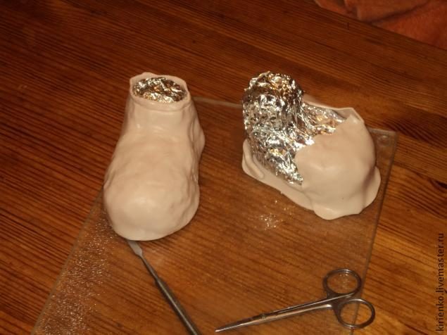 Сверху фольгу закрываю листами ливингдолла. В общем достаточно накладно. Но делать дешево и тщательно я поленилась, грешна! В идеале я должна была сделать болванку из пластилина, обклеить ее папье-маше и таким образом получить полую бумажную форму. Но это долго. На ноги, надо сказать, ушла треть пачки ливингдолла.