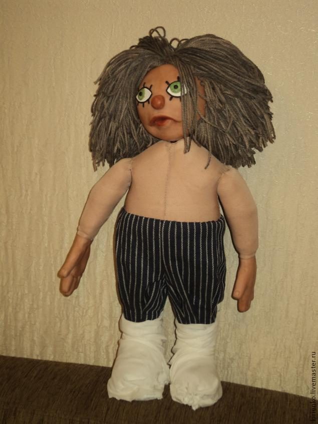 Подстригу я его попозже, а теперь начну одевать. Первым делом штаны. Мне повезло и штанины налезли на ноги. Так что все швы — машинные. Руками шила только на талии и прихватила штанины по низу.