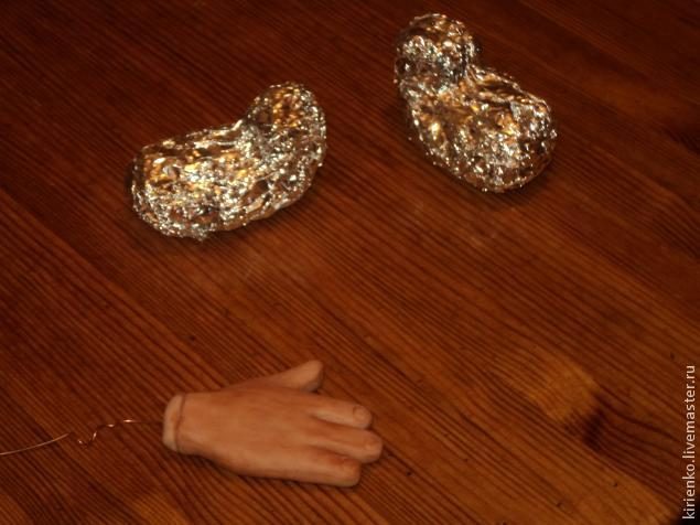 Пора подарить парню ноги. Из фольги формирую нечто похожее на щиколотку, торчащую из лаптя.