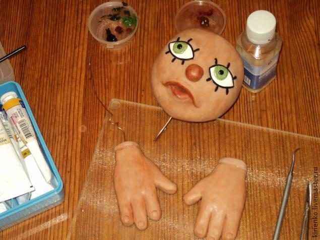 Дальше все просто. Леплю ручки. В мультфильме у Кузи три пальца. Не вижу смысла усложнять себе жизнь четвертым и тоже делаю три. Так же, как и голову, запекаю в духовке и, уже остывшие, тонирую маслом. Меня вполне устроит неровный с разводами окрас, так как своего Кузю я буду делать немытым.
