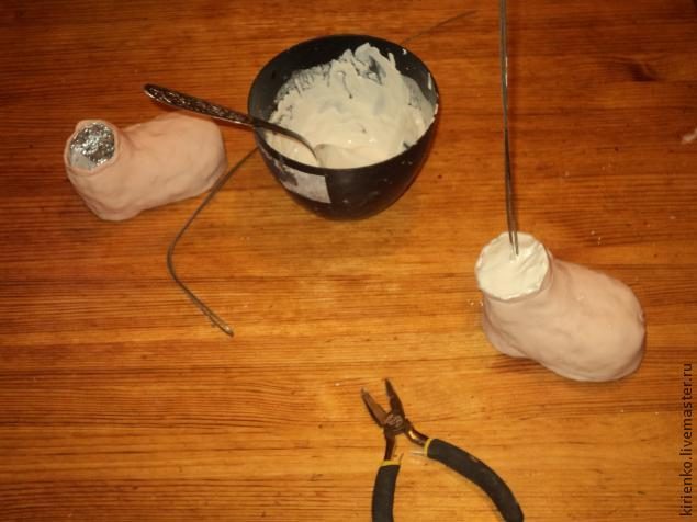 Выковыриваю фольгу. Получаю две ноги в которые вставлю стальную проволочку и залью гипс. В гипс необходимо добавить наполнитель. В идеале шарики пенопласта. Они облегчают гипс и не дают ему при расширении разорвать форму.