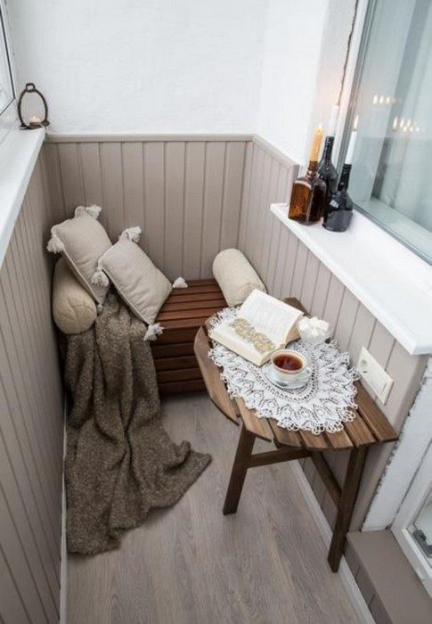 Приятно с утра выпить чашечку горячего чая или кофе на балконе, любуясь рассветом или листая любимую газету (журнал). Чтобы полноценно наслаждаться процессом балкон нужно дополнить несколькими предметами мебели – удобным креслом, пуфиком или банкеткой, а также небольшим кофейным столиком. Для создания уютной атмосферы пригодятся ваза с живыми цветами, декоративные подушки, небольшой тёплый коврик под ноги, плед.