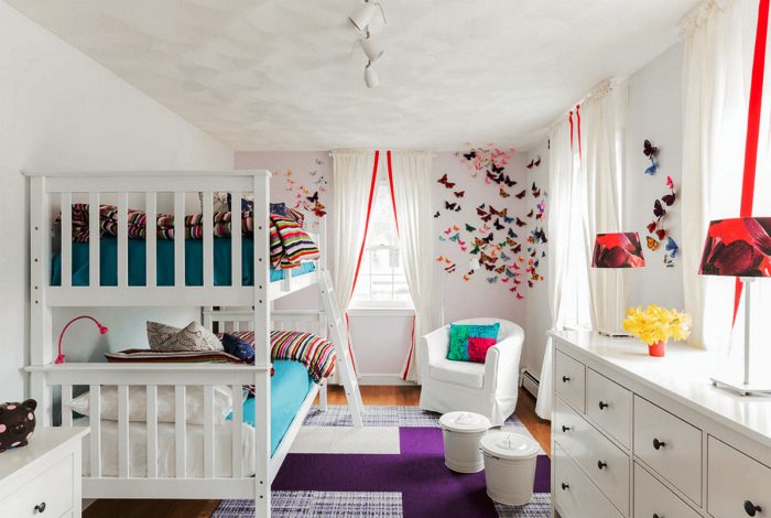 Просторная детская с белыми стенами, двухъярусной кроватью, яркими бабочками на стенах и множеством цветных деталей станет уютным пристанищем для двух девочек-погодок.