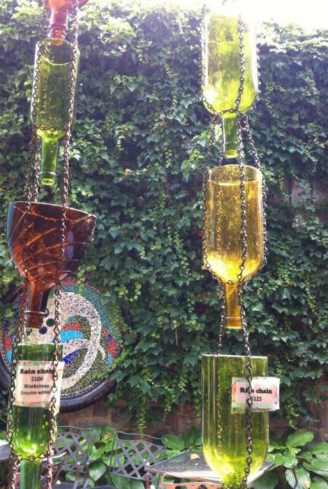 Дождевые цепочки для сбора воды, которые можно сделать своими руками из стеклянных бутылок и медных цепей.