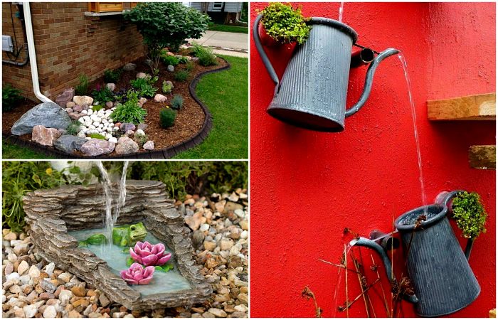 Мини пруд, сооруженный под водосточной трубой, будет наполняться водой после каждого дождя и радовать глаз своим очаровательным внешним видом.