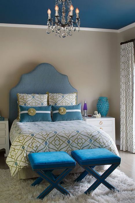 Если комната небольшая и с низкими потолками, то здесь гармонично будут смотреться оттенки синего и голубого, зрительно они сыграют на положительный результат и словно сделают потолок немного выше.