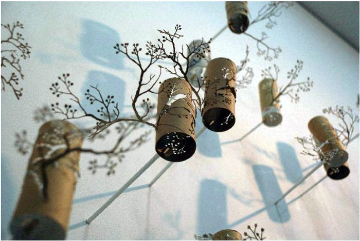 Оригинальные композиции из картонных втулок с фигурными разрезами и сухих веток, станет изысканным украшением любой стены.