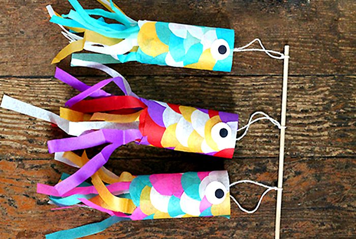 Восхитительная яркая гирлянда с рыбками, сделанными из картонных втулок, покрашенных яркими красками и дополненных гофрированной бумагой.