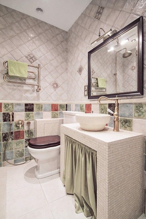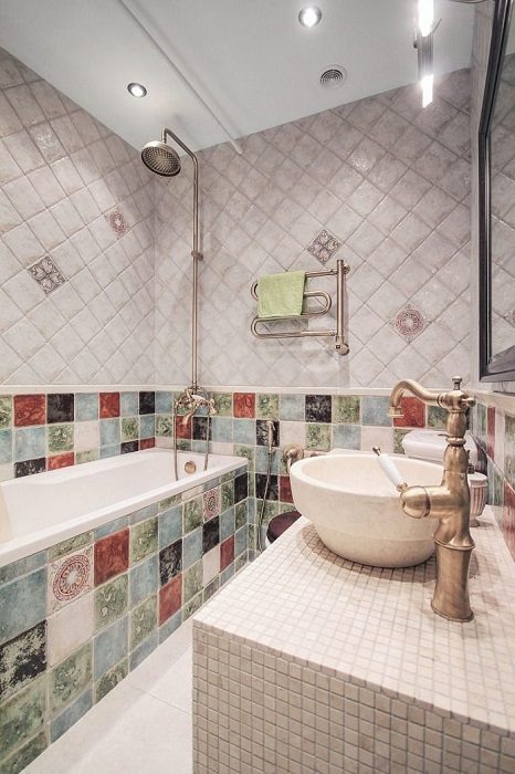 Туалет и ванную комнату совместили. Оригинальное сочетание плитки двух видов и сантехника в винтажном стиле делают ванную невероятно стильной и роскошной.