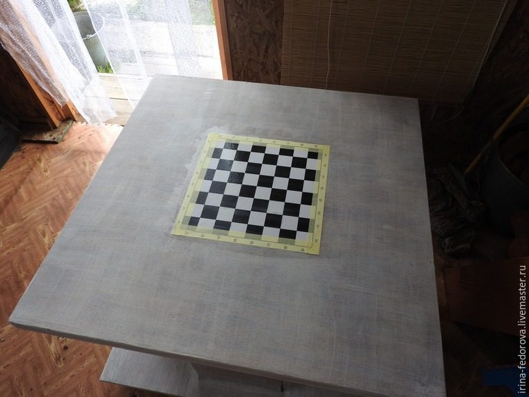 6. Когда стол сох, я из картона сделала коробочку для шахмат и шашек, не буду описывать, как я это сделала, так как на Ярмарке множество мастер-классов по изготовлению коробок. На коробку я нанесла трафарет шахмат. Стол и коробку покрыла лаком, столешницу на 5 раз, а остальные части на 3 раза с промежуточной сушкой каждого слоя.