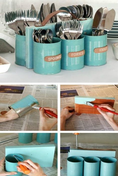 Практичный и стильный органайзер для столовых приборов из нескольких жестяных баночек и небольшой деревяшки, который под силу сделать даже подростку.