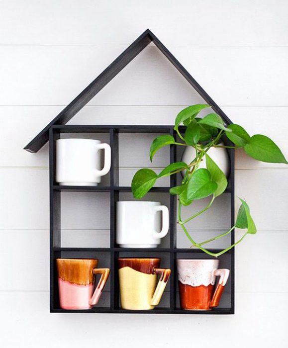 Креативная полка в виде домика прекрасно подойдет для хранения чашек и станет чудесным украшением одной из стен кухни.