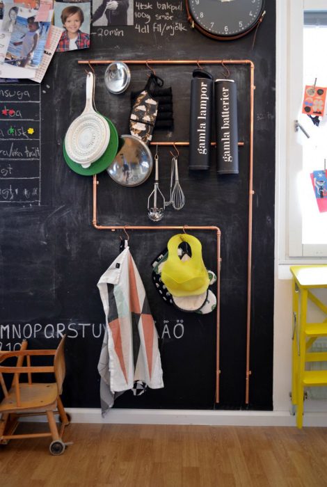 Оригинальный органайзер из медных труб станет стильным украшением свободной стены и прекрасно подойдет для хранения шумовок, лопаток, мерных стаканов, разделочных досок, фартуков и прихваток.