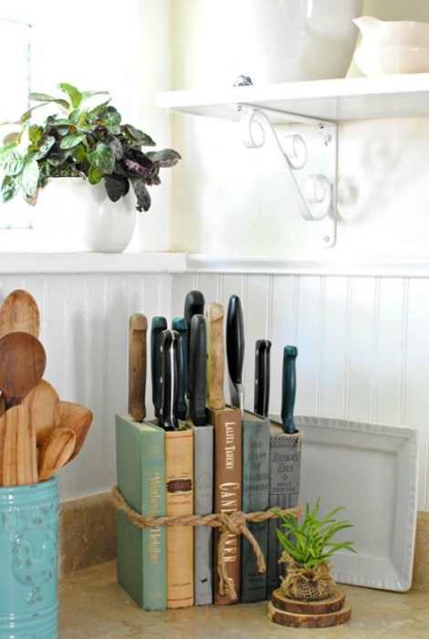 Ненужные книги в твердом переплете можно использовать для создания оригинальной подставки для ножей. Такая подставка станет не только функциональной составляющей пищеблока, но и его необычным украшением.