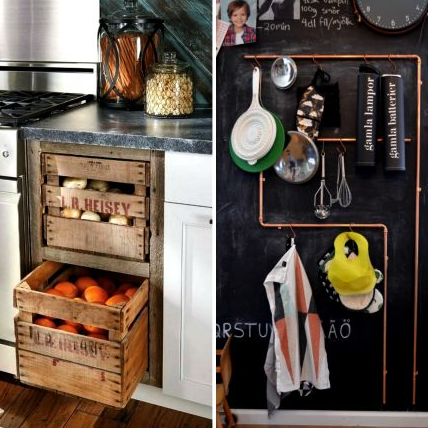 Оригинальный пример использования обычных деревянных ящиков в качестве системы хранения для овощей и фруктов.