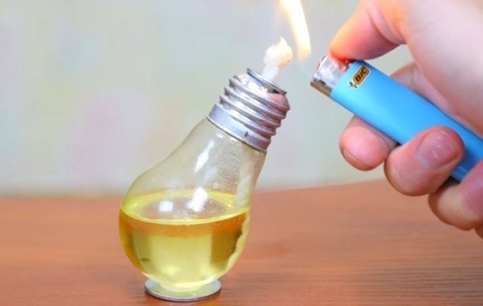 Масляная лампа делается очень просто. Освобождаете лампочку изнутри, заливаете туда масло и опускаете обычную бечевку. Будьте аккуратны при использовании и создании такой лампы!
