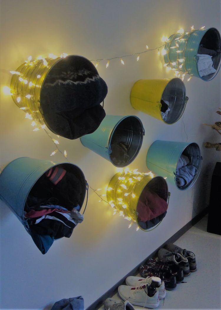 3. Бум на оригинальные хранения вещей до сих пор актуален, поэтому берите на заметку необычные «ящики», предварительно ведра можно покрасить. И не беда, если их дно уж с дырами