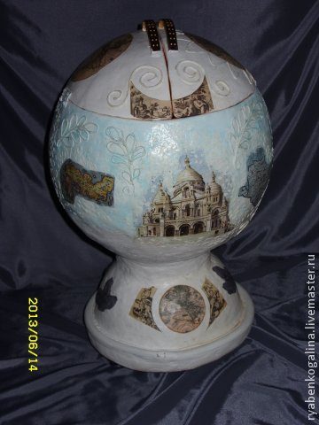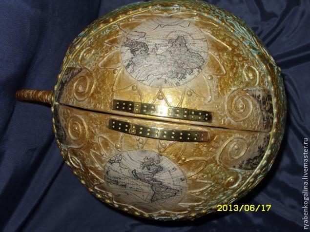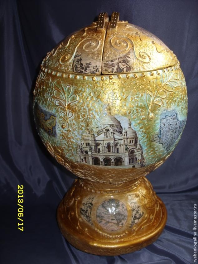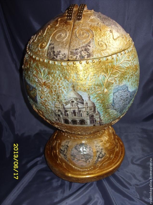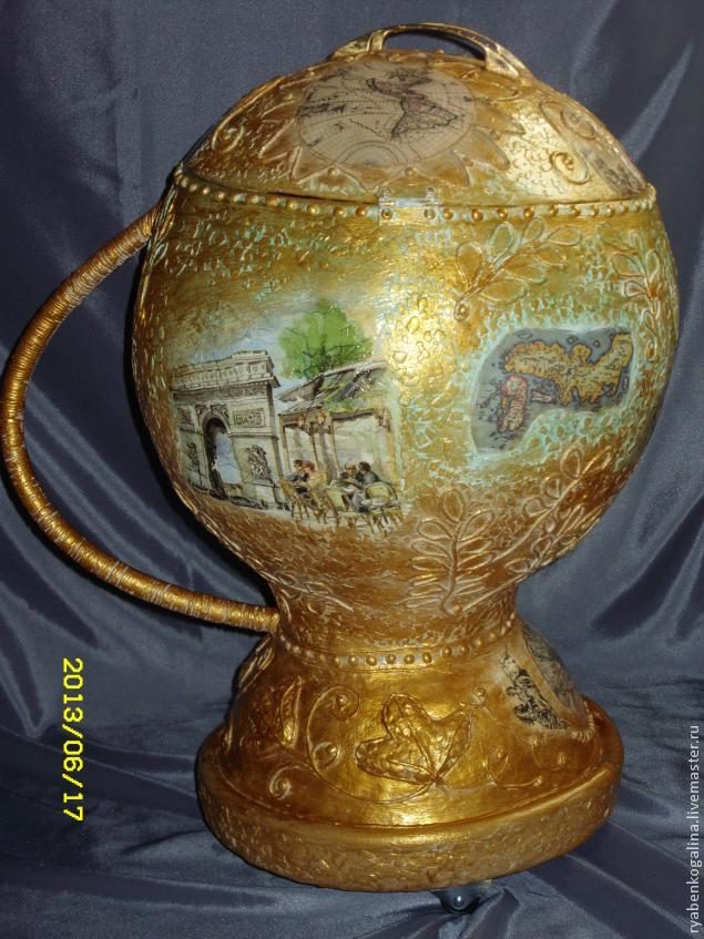 Такой глобус-сундук я сделала из газет, массы папье-маше, клейстера и других материалов. Кроме техники папье-маше использовала и другие техники: декупаж, пейп-арт, яичное кракле.