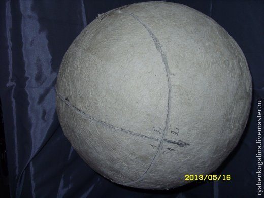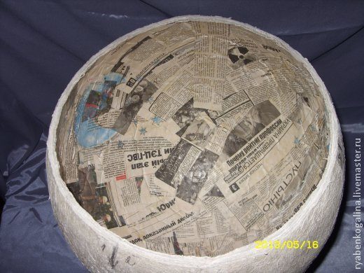 Сначала надула огромный воздушный шар и обклеила его газетами в несколько слоев и многократных просушок, еще для закрепления обмотала нитками прочными и сеткой строительной обклеивала, бинтом, снова бумагой, начиная от газет и всей бумагой, которая подходит для этого вида творчества. Я использовала и чеки всевозможные и инструкции от таблеток, офисную бумагу.