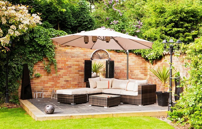 Лучше всего обустроить патио у стенки дома с западной или восточной стороны, которая будет получать естественное освещение.