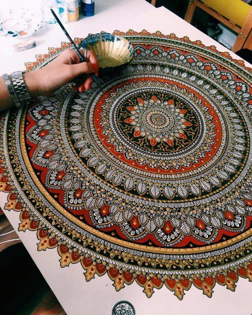Британская художница йеменского происхождения Асмахан Мослех (Asmahan Mosleh) рисует потрясающие мандалы акриловыми красками, наполняя их акцентами из золотистых листьев.
