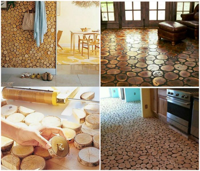 Маленькие деревянные спилы — прекрасный и достаточно бюджетный материал для отделки стен и пола. Конечно, на реализацию такой идеи понадобится время и некоторые дополнительные материалы, но конечный результат того стоит.