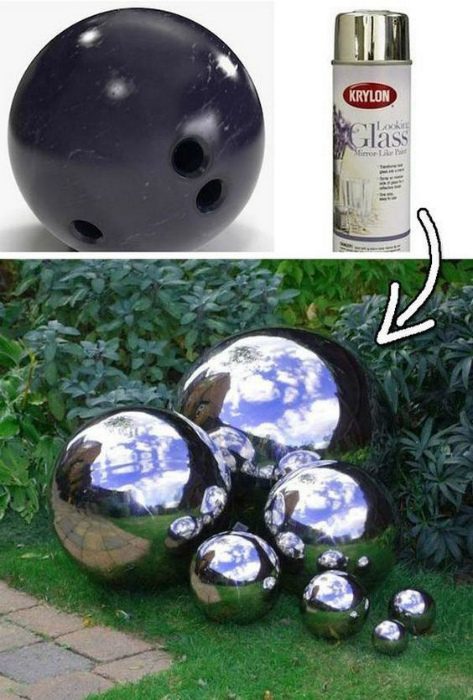 Шары для боулинга и мячи можно использовать для создания уникальной композиции, которая станет настоящей изюминкой сада. Все, что потребуется для реализации такой затеи — это баллончик специальной краски с металлическим эффектом.