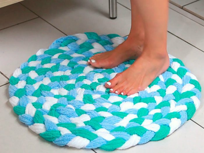 Потрепанные банные полотенца — прекрасный материал для создания мягкого и яркого коврика. Готовое изделие можно постелить в коридоре, в ванной комнате или в спальне у кровати.