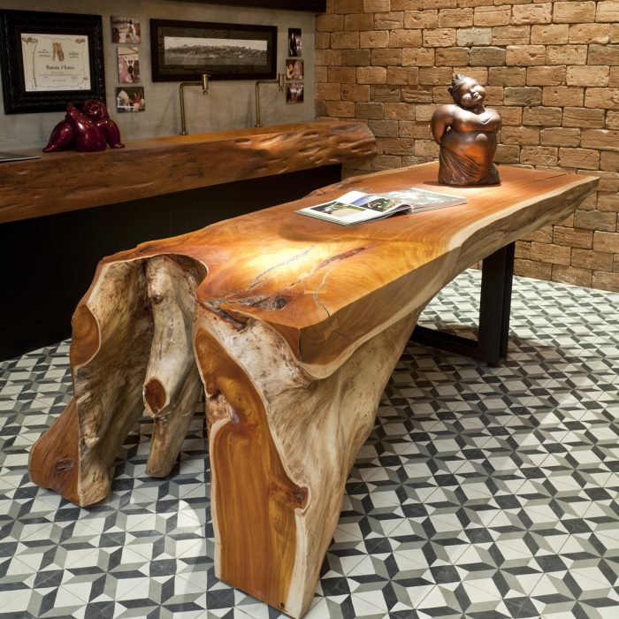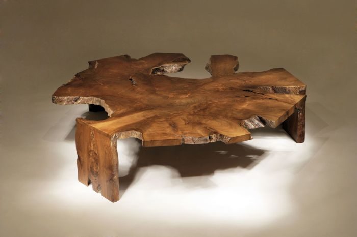 Стол из дорогой необработанной древесины будет гармонично смотреться в любом современном интерьере.