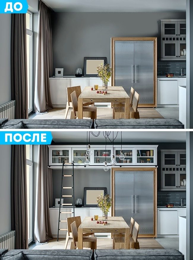 Если в квартире не хватает места и кажется, что эту проблему решит только переезд, то, скорее всего, здесь может помочь простая лестница. Не бойтесь высоких полок, сделайте их под самым потолком. Тогда на них не будет скапливаться пыль и места в комнате станет значительно больше.