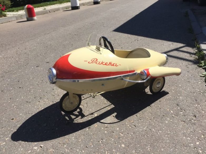 Именно о таком аппарате я хочу рассказать сейчас. Педальная машинка «РАКЕТА» (с незначительным отличиями она выпускалась также под названием «СТРЕЛА») — редкий зверь среди своих собратьев. И дело не только в возрасте (производство относится к 1960-м годам) и небольшом объеме выпуска, но и в самом материале для кузова. Это единственная машинка, которая была выпущена из алюминия! Казалось бы — именно это обстоятельство должно было сохранить максимальное количество Ракет (ведь этот цветной металл не подвластен ржавчине), но результат был прямо противоположным — в трудные времена эти машинки безжалостно сдавались в пункты приема цветмета ((