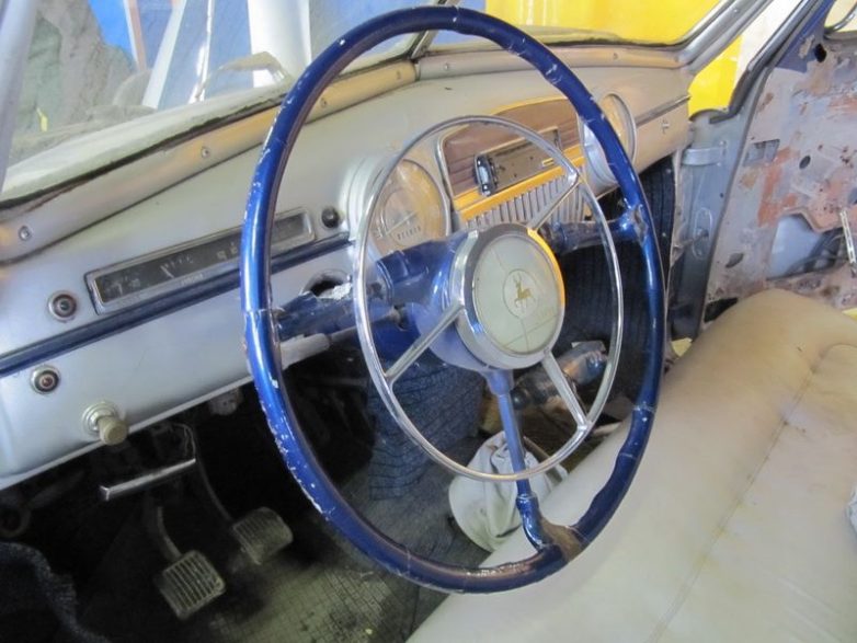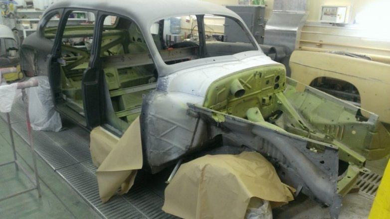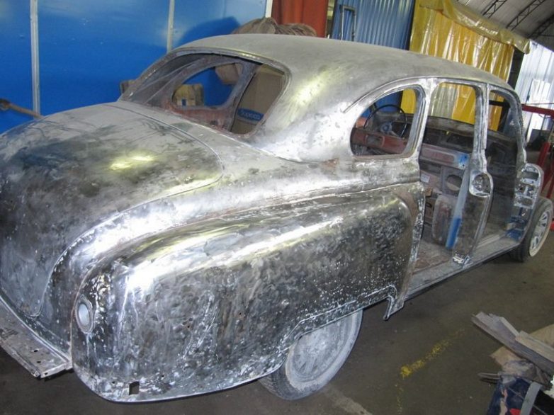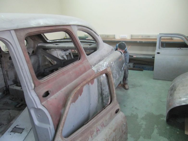 Начало работы, автомобиль 1954 года выпуска. Ведется разборка кузова, многие элементы были кустарно ремонтированы, хром покрашен серебрянкой и кое-где заменен на китайский пластик…