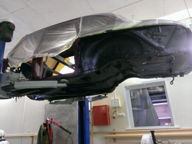 «Вишнёвого» перекатили на подъёмник для обработки травящим грунтом днища кузова.