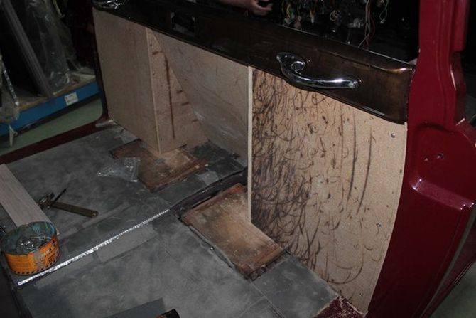 Паралельно со сборкой кузова активно продвигалась и работа над салоном нашего лимузина. Изнутри салон был покрыт вибро и шумоизоляцией. Многие обшивки и панель приборов были перетянуты кожзамом. Спинку переднего дивана пришлось переделать — в неё будут встроены дополнительные печки для пассажиров и аудиосистема. Кроме того там будет располагаться минибар.