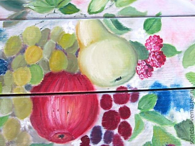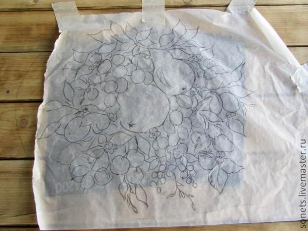 -Для росписи выполним эскиз на кальке или листе бумаги. Произвольно рисуем фрукты-ягоды и листья. Для образца можете взять фото натюрморта или уже готовый чужой рисунок. Я взяла роспись Мастерицы Ольги Украинской, очень уж мне понравилось богатство и расположение фруктов.