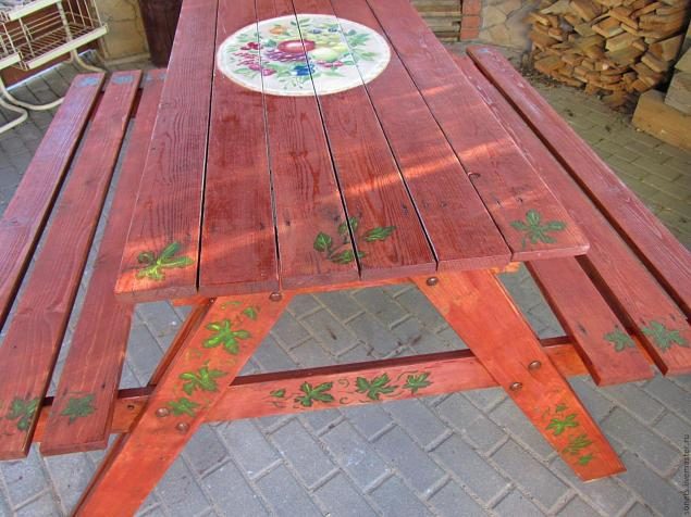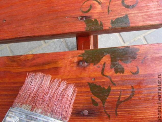 -Пыль вытрем влажной тряпкой. Пусть чуть подсохнет. Затем, с помощью трафарета и валика смесью зеленой и черной акриловой краски, нанесем рисунок листьев произвольно по столу и скамье.(рис. 5 и 6)