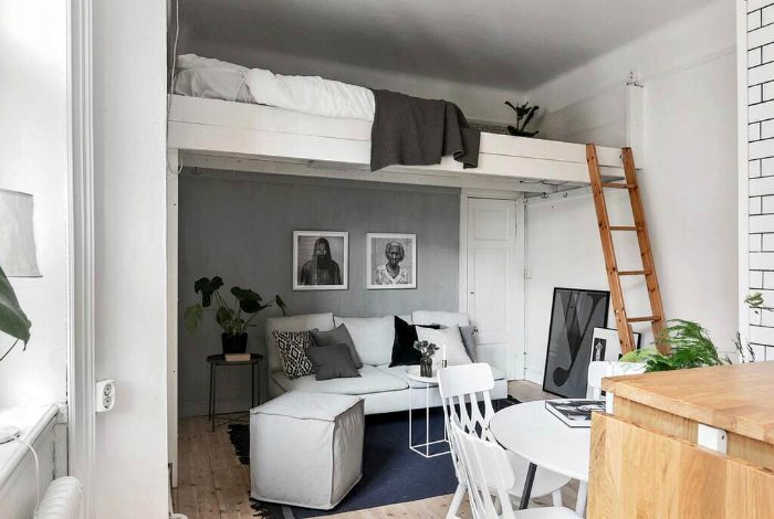 Крошечная комната с диваном, круглым столиком и кроватью под потолком — прекрасный пример грамотно использования квадратных метров в однокомнатной квартире.