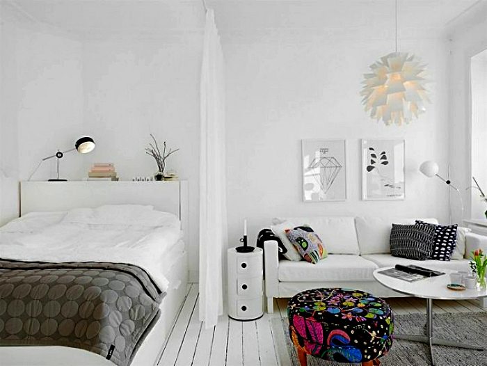 Чудесный интерьер маленькой комнаты, совмещающей в себе место для сна и зону для отдыха и приема гостей. Белая отделка стен и пола делают это помещение визуально больше и светлее, светлая занавеска разделяет две функциональные зоны, а яркий текстиль и предметы декора делают это пространство динамичным и жизнерадостным.