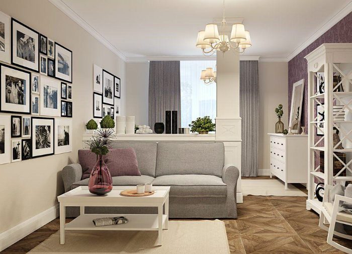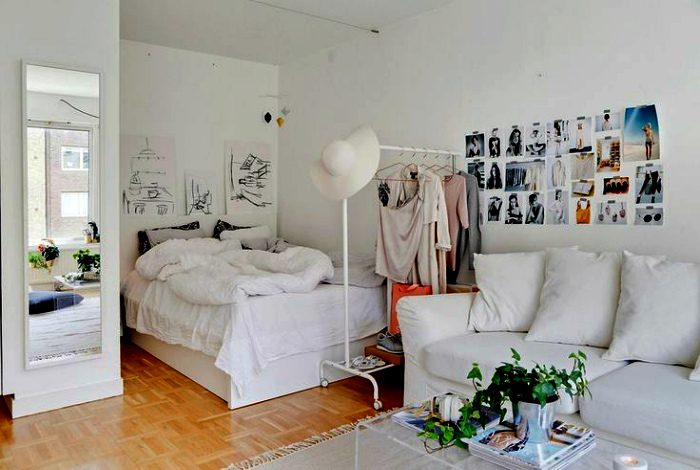 Просторная комната со светлыми стенами, белоснежным диванчиком, журнальным столиком из стекла, кроватью в нише, огромным количеством фотографий на стене и оригинальной напольной вешалкой, которая разделяет гостиную и спальную зону.