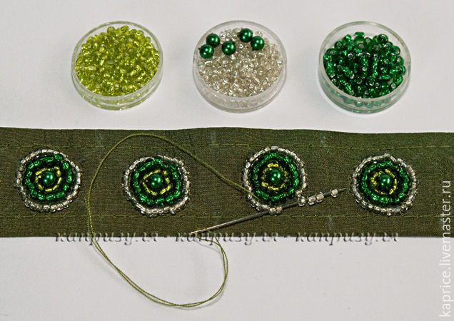Первой пришиваем бусину, вокруг зелёный бисер, затем вокруг пришиваем тёмно-зелёный бисер, и тем же способом иголка вперёд-назад пришиваем вокруг серебристый бисер.