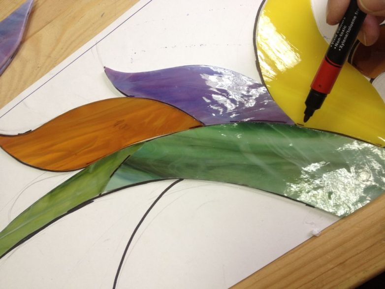 В данной работе мне удобно было собирать витраж фрагментами: сначала я сделала части с перьями, потом соединила их фоновым стеклом.