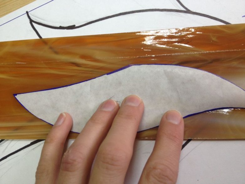 Все необходимые детали перенесла на кальку, вырезала и далее по этому шаблону перенесла на стекло. Как всегда, перед раскроем стекла я сначала заглядываю в контейнер с обрезками, вдруг найдутся кусочки подходящего размера, и только потом уже начинаю работать с большим листом.
