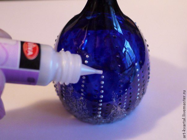 2. Наносим на всю поверхность бокала витражный лак синего цвета. Примечание: витражный лак фирмы Viva Decor очень хорошо и достаточно ровно ложиться на поверхность стекла. Чтобы в процессе нанесения лака избежать появления маленьких пузырьков, которые портят весь вид работы, не следует перед началом работы встряхивать баночку с лаком.Кисти после работы отмываем в растворителе(уайтспирит или ацетон).Даем лаку полностью высохнуть около суток.